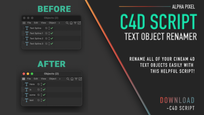 C4D Script: Text Object Renamer This free Cinema 4D Script will automatically rename your text objects to the name inside the text field. This makes finding these objects in the object manager much easier! By default, the script will only modify the objects you select. If you hold SHIFT while activating the script it will…